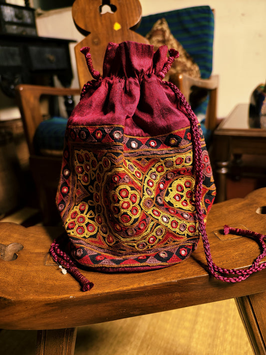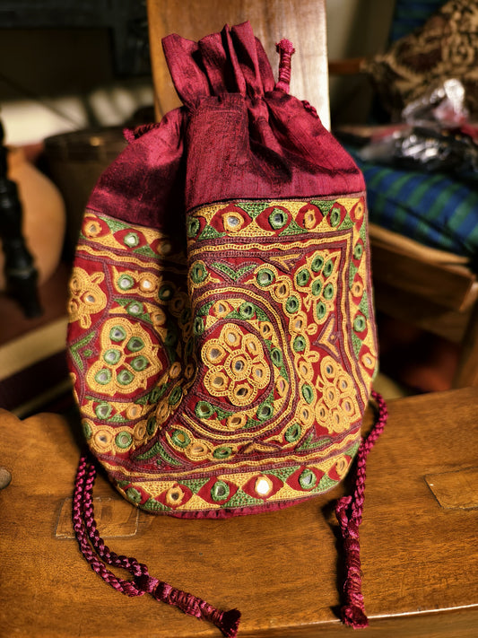 Maroon Kutch Hand-Embroidered Mirror Work Potli Bag