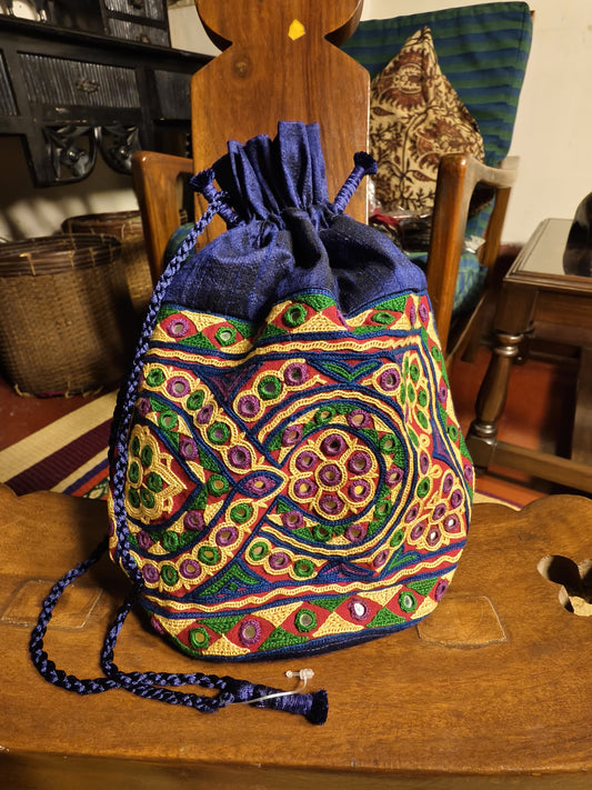 Blue Kutch Hand-Embroidered Mirror Work Potli Bag