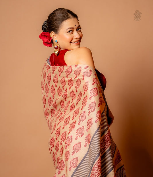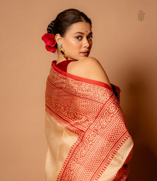 Handwoven Pure Mulberry Bengal Silk Saree Off-White - Red