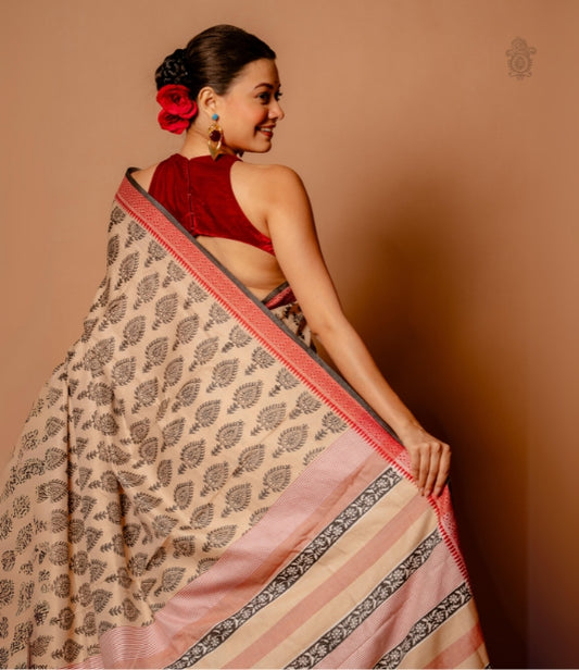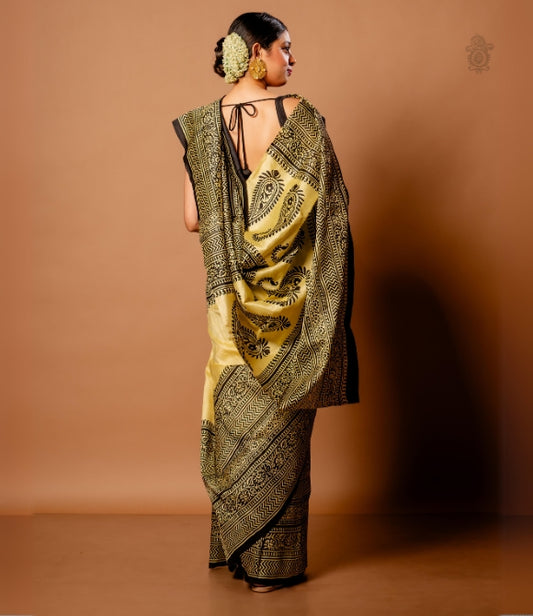 Handwoven Pure Mulberry Bengal Silk Saree Cream Black