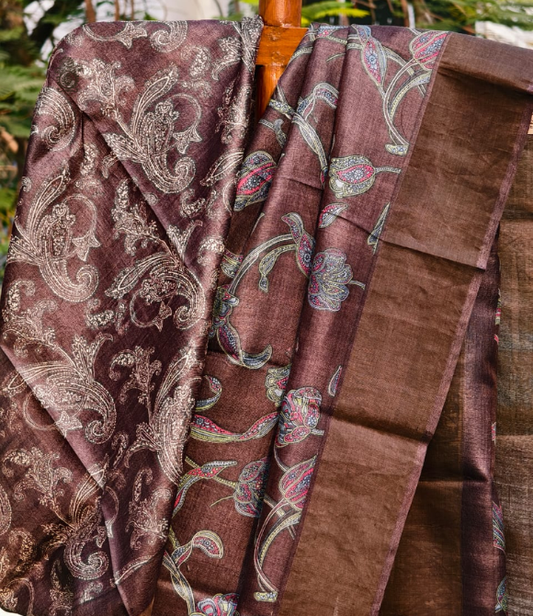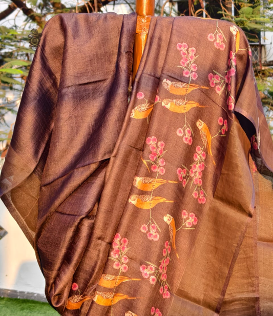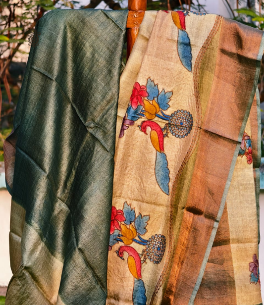 Pure Zari Tussar Hand Embroidery Saree Sage Green