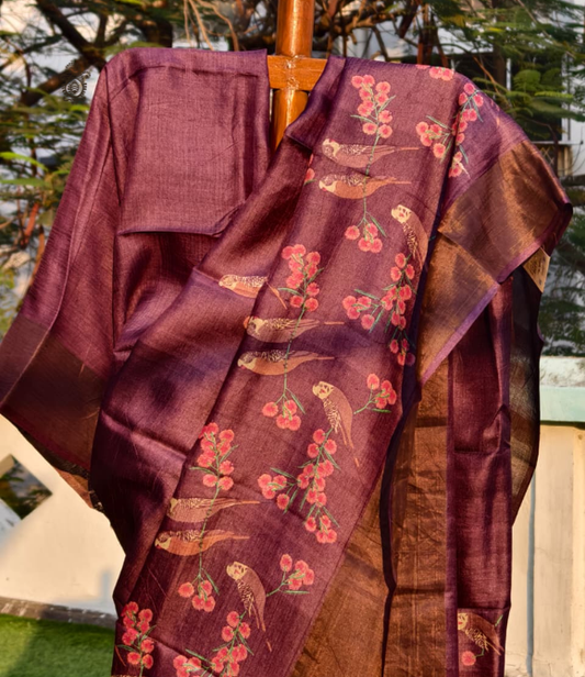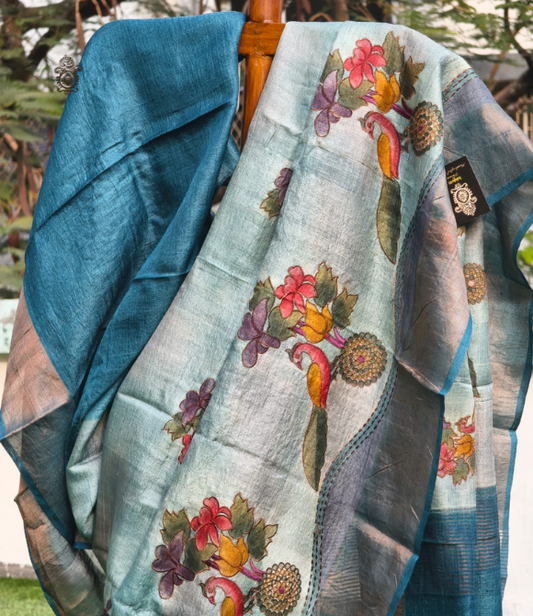 Pure Zari Tussar Hand Embroidery Saree Greyish Blue